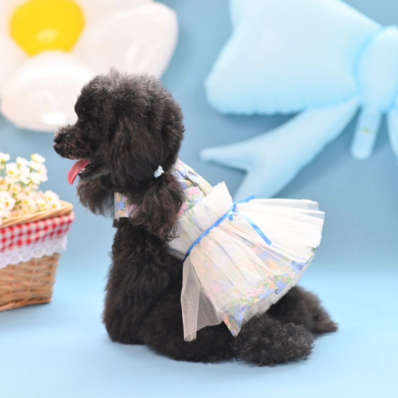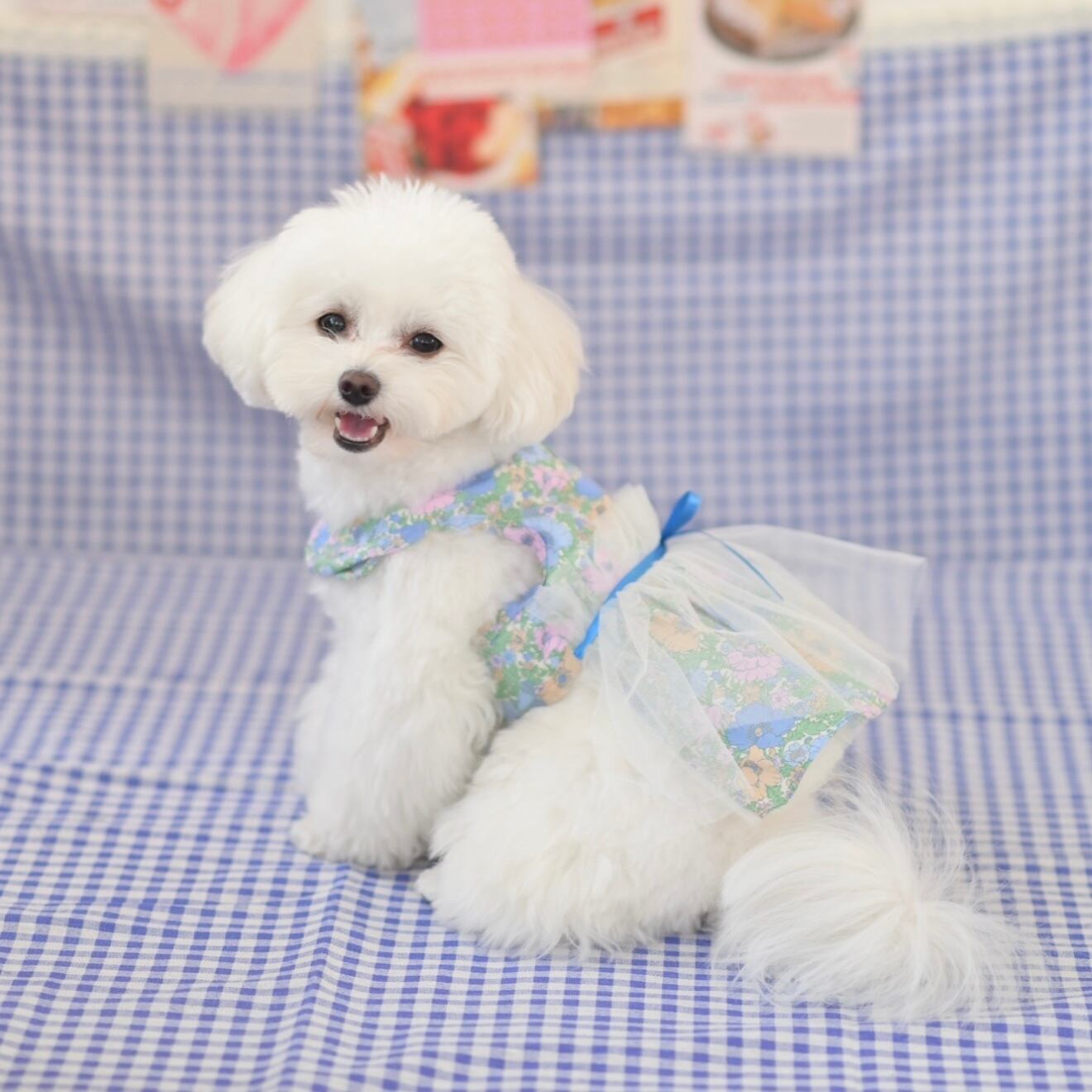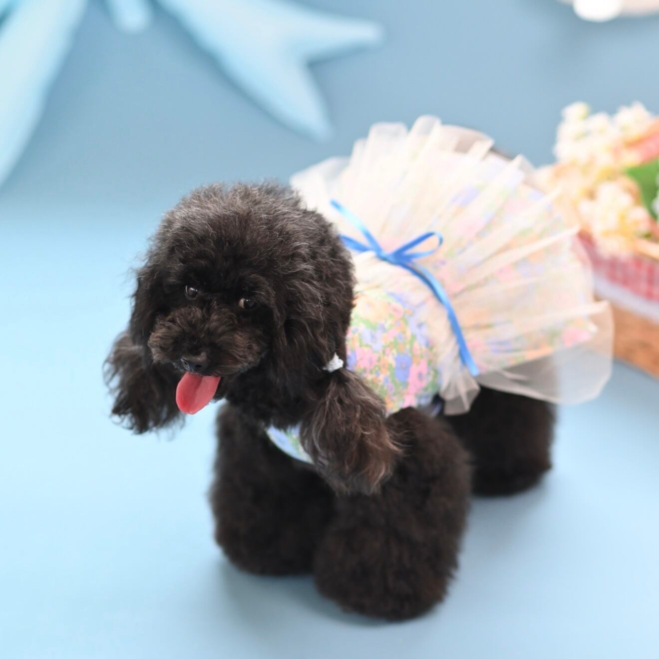 ナチュラルスタイルにもガーリースタイルにもマッチするブルーのリバティハーネスは、愛犬の可愛らしさを引き立てながら、快適でおしゃれな時間を演出します。