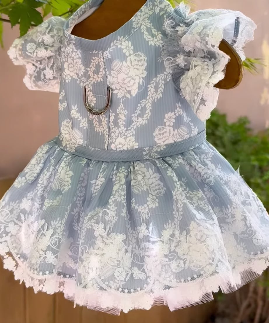 柔らかながライトブルーが上品な清涼感を纏い、光を受けるたびにさりげなく浮かび上がる柄が、奥行きのある美しさを演出します。ふんわりと広がるスカートラインは、幾重にも重ねた生地によって軽やかさと華やかさを両立し、まるでクチュールドレスのような存在感を放ちます。
